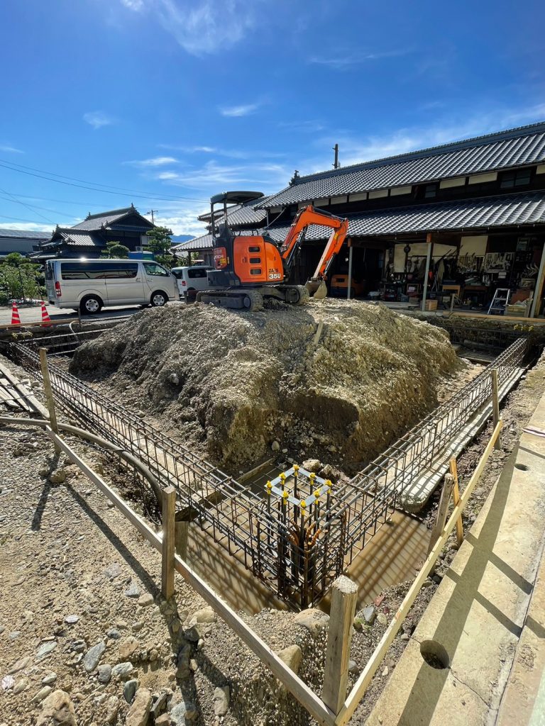 西条市M様の倉庫の基礎鉄筋施工完了して型枠工事が始まっています
